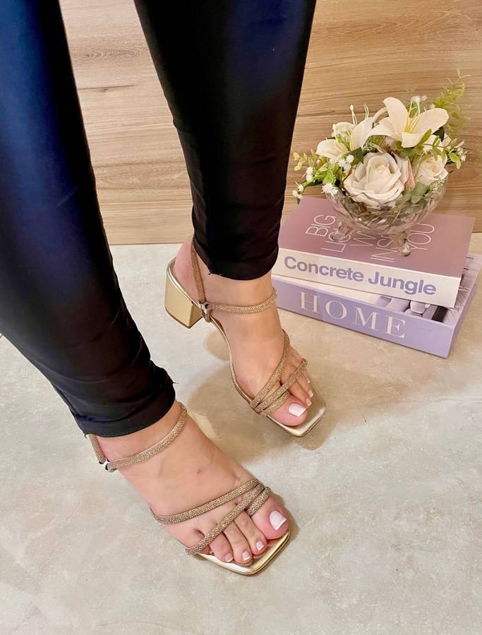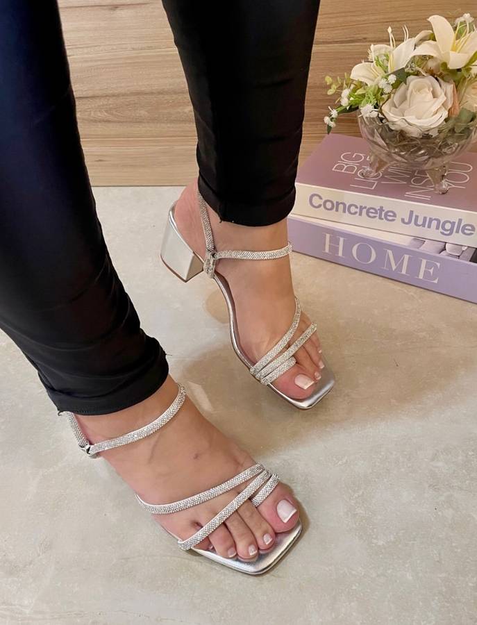 Sandália salto bloco com tiras de strass com ajustes na lateral .