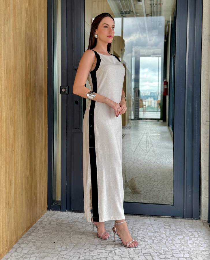 Vestido em linho com detalhes nas laterais com botões, forrado, linho pré lavado. Temos M G e GG.
