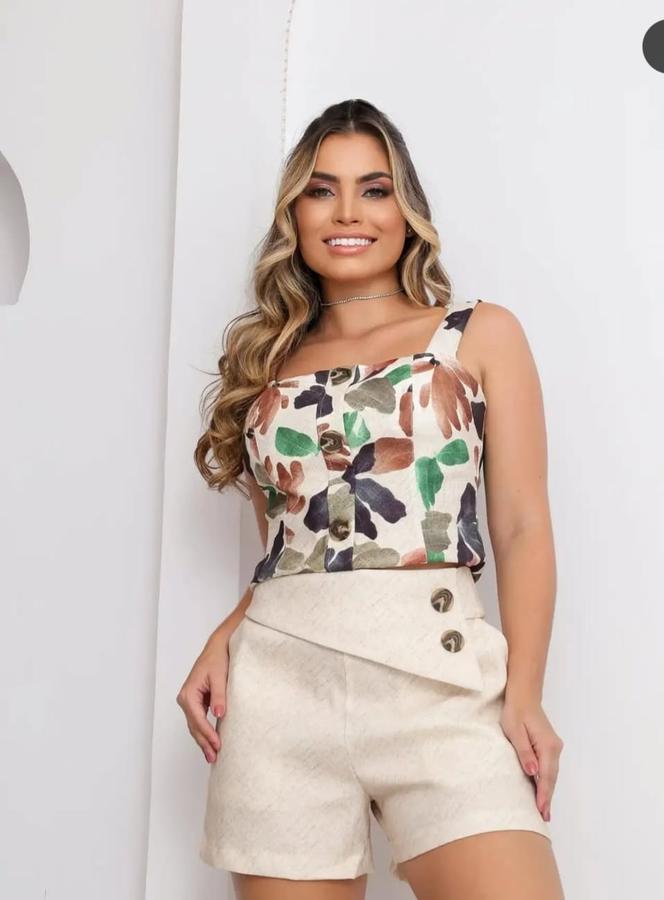 Conjunto short e cropped em poliamida, possui bojo. Várias opções de estampas, tamanhos P ao GG.