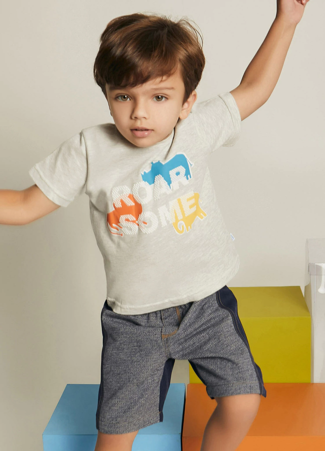 O conjunto infantil “Roar Some” é composto por camiseta infantil cinza com silk frontal de animais selvagens e bermuda infantil cinza com detalhe azul na lateral e elástico no cós.