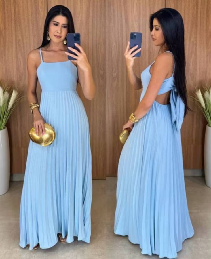 Vestido plissado, com amarração nas costas, possui bojo. Tamanho único, veste de 36 a 44. Cores disponíveis: azul bebê e rosa bebê.
