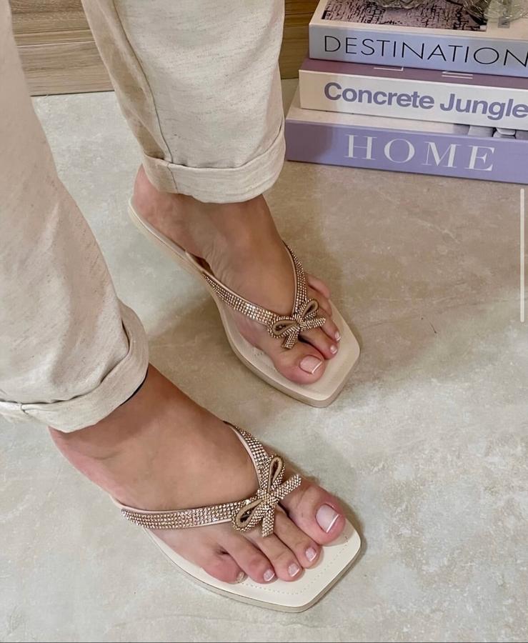 Chinelo rasteira com tiras de strass e um laço,solado borracha de bico quadrado!!