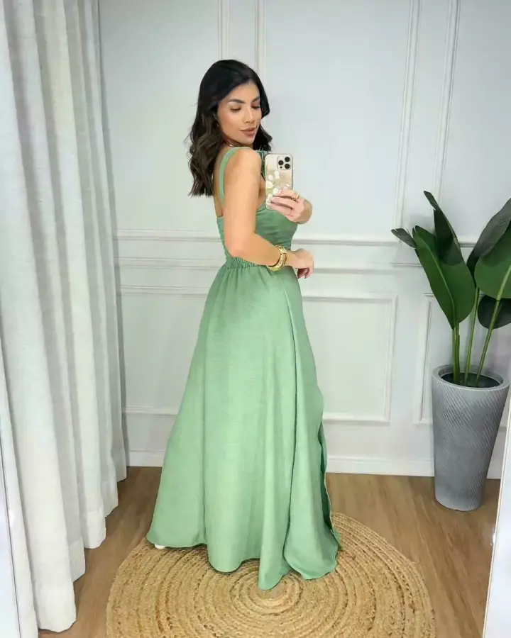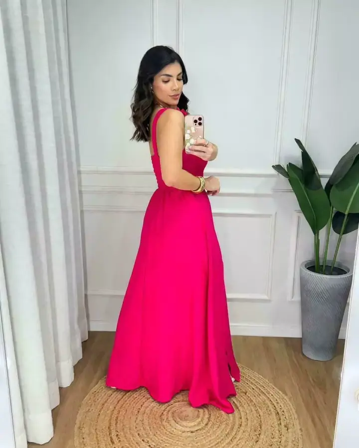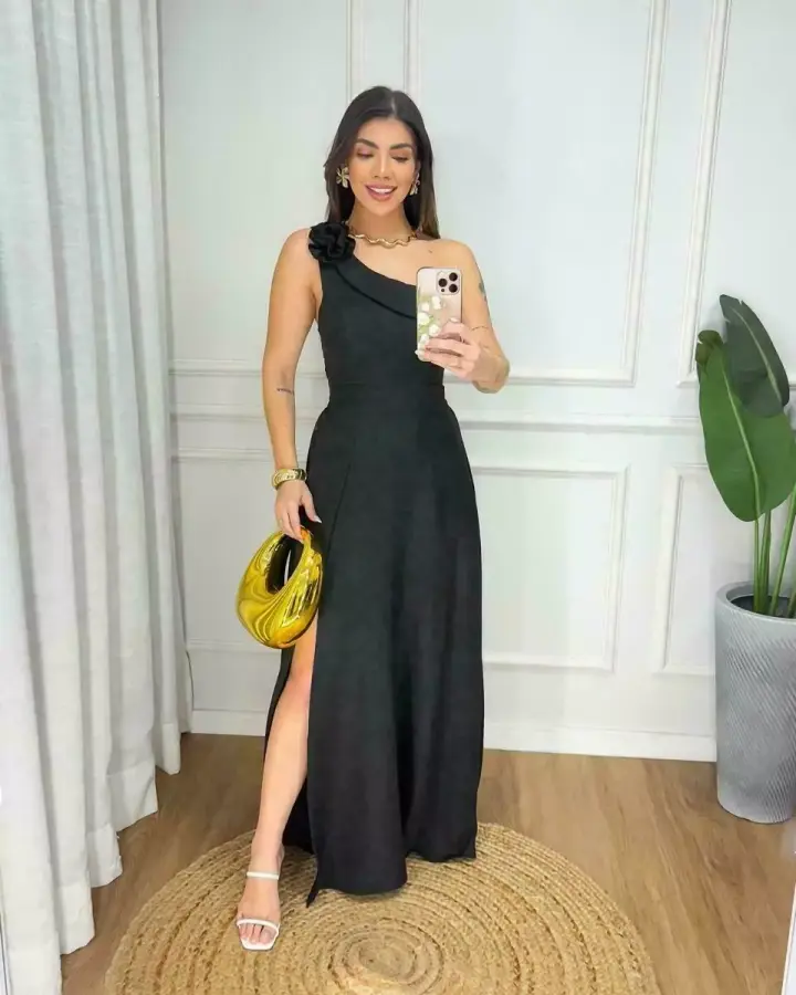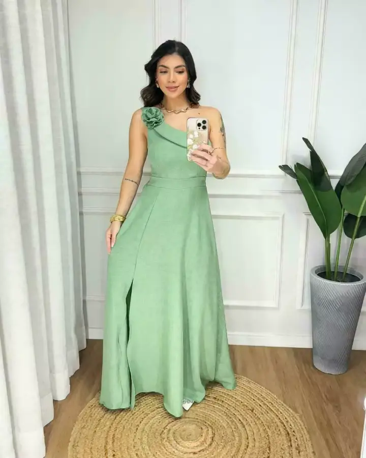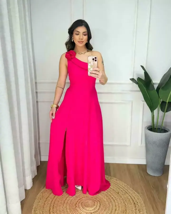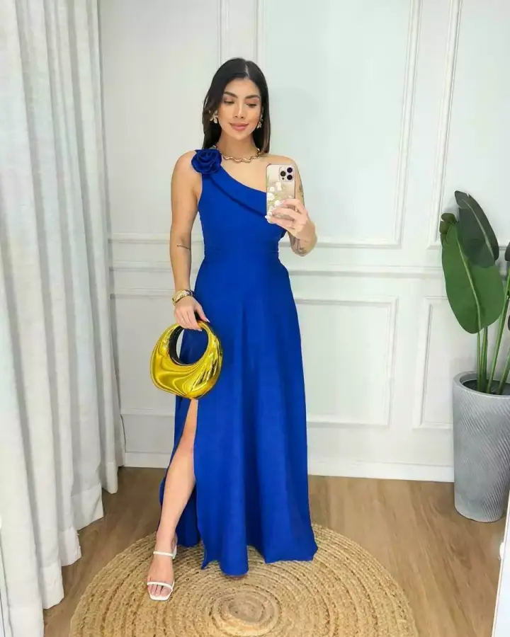 Vestido maravilhoso acinturado, possui detalhe em flor na alça, fenda discreta na perna, corra e garanta já o seu!